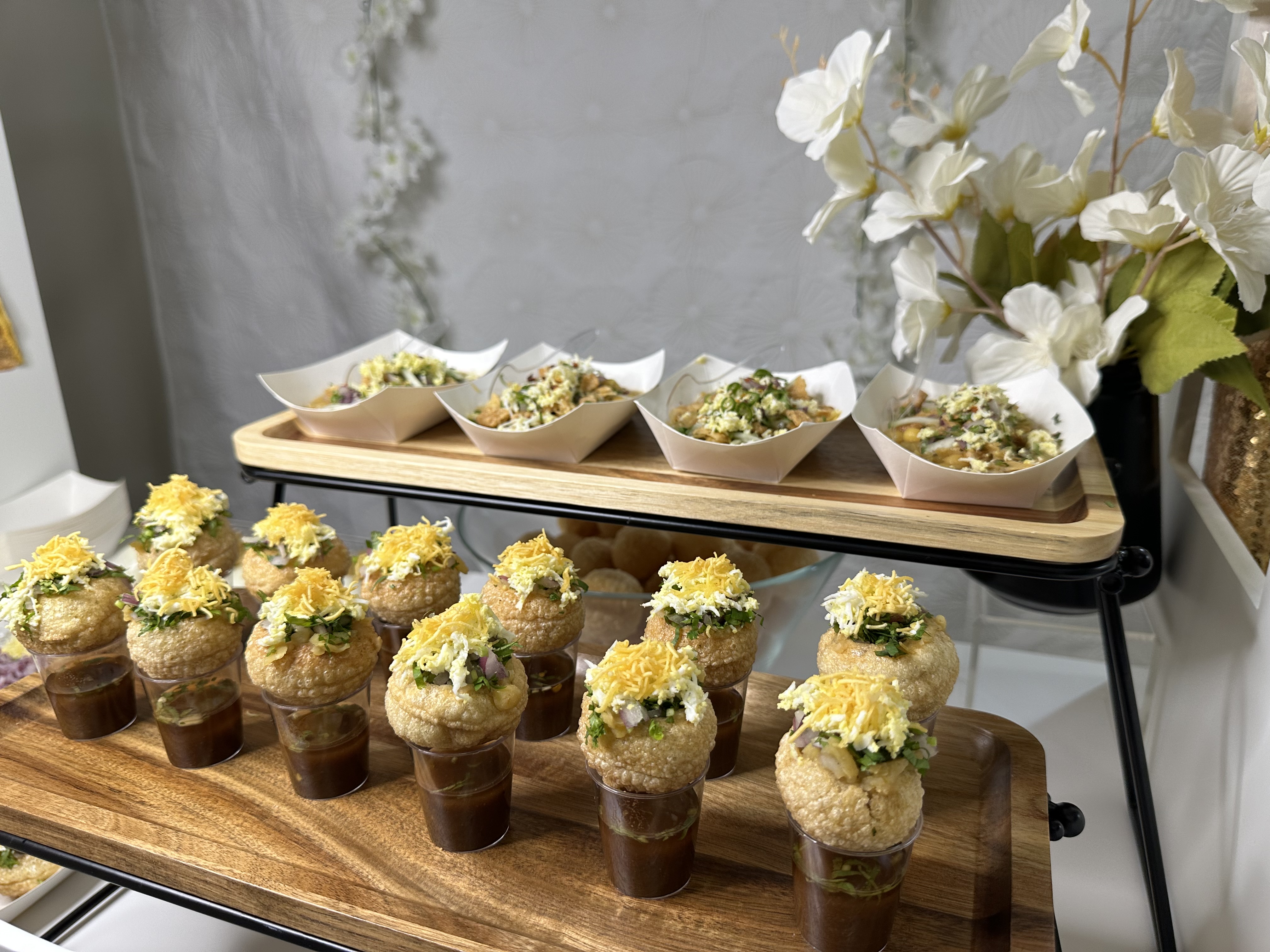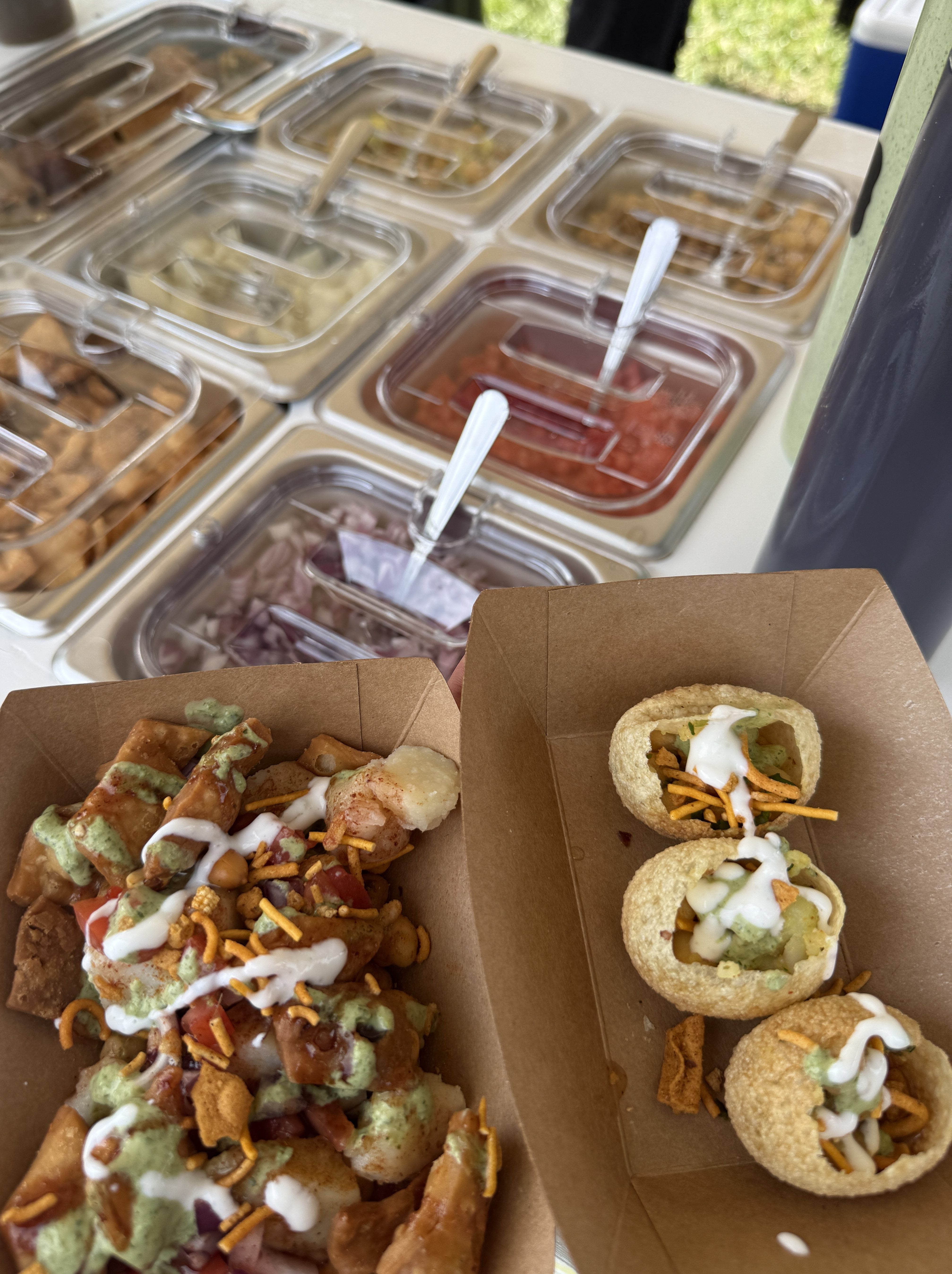 Crispy samosa crumbled & topped with potatoes, a medley of tangy yogurt, spicy tamarind chutney, and a sprinkle of savory chickpeas, onions, and tomatoes.